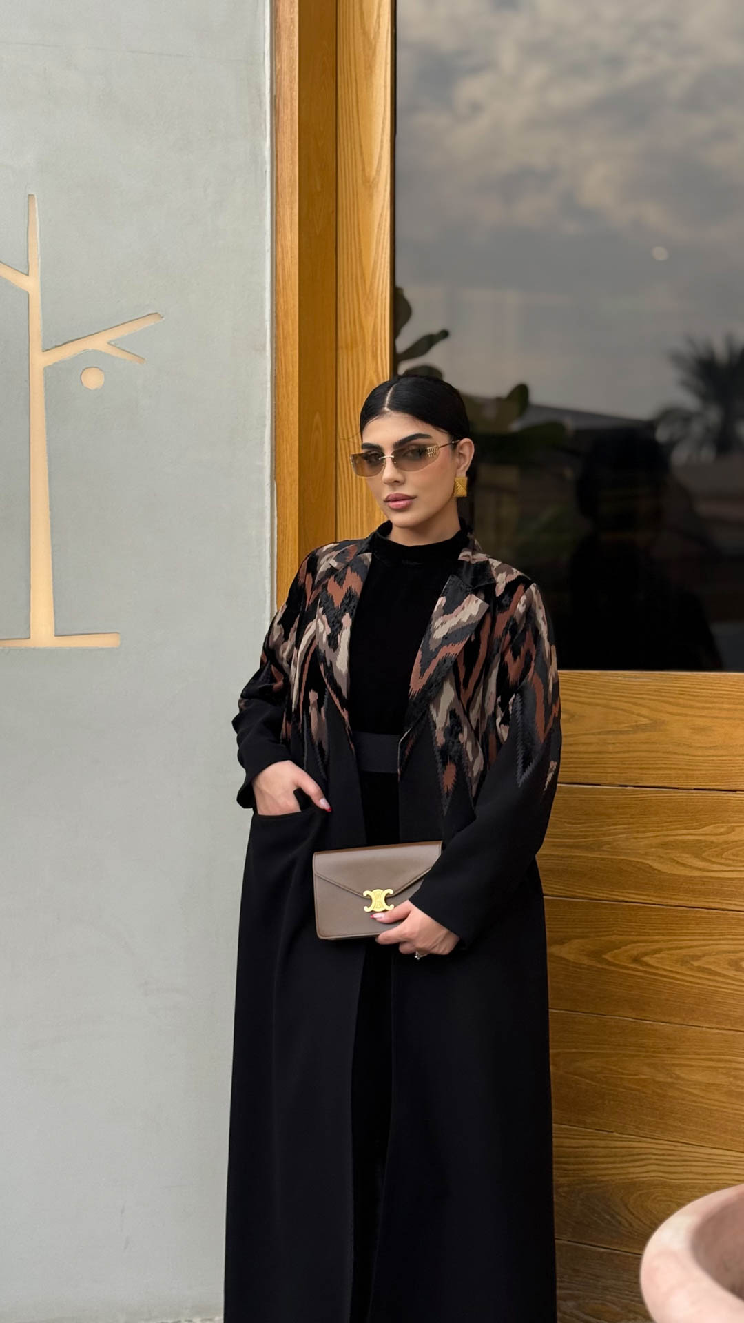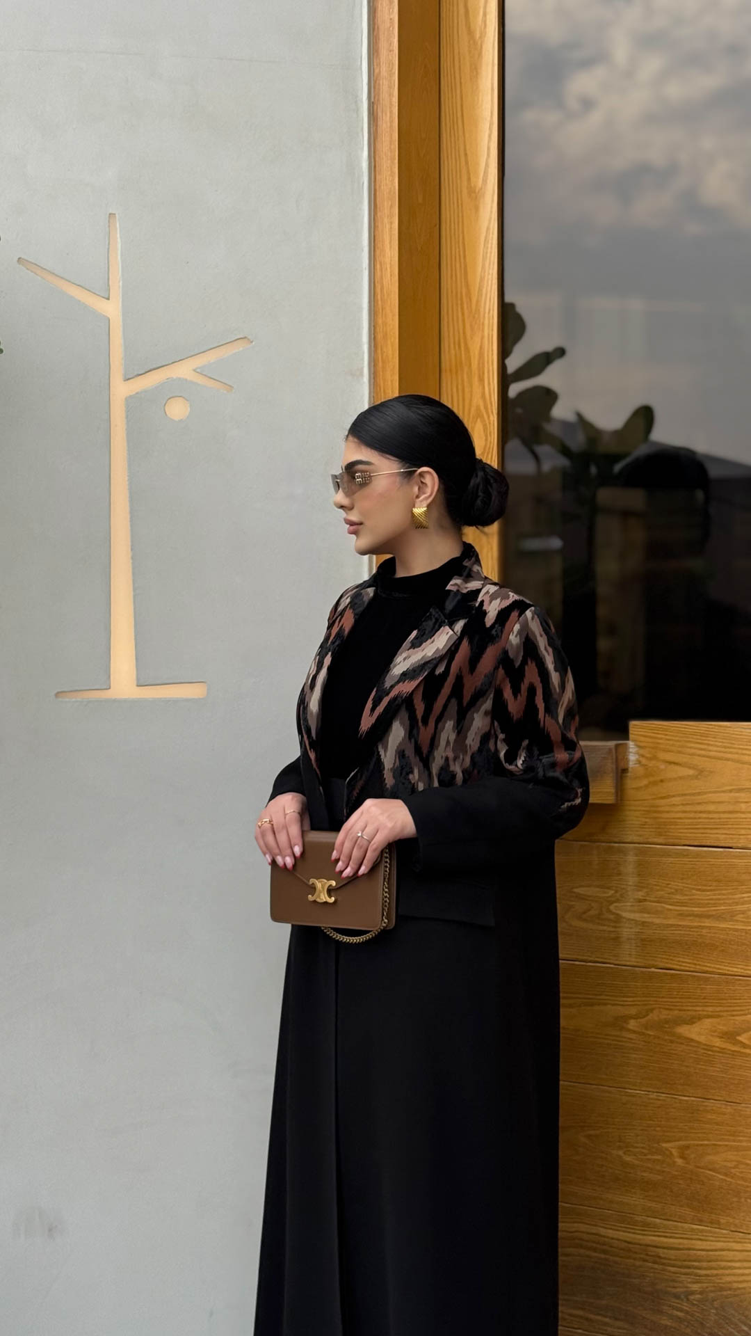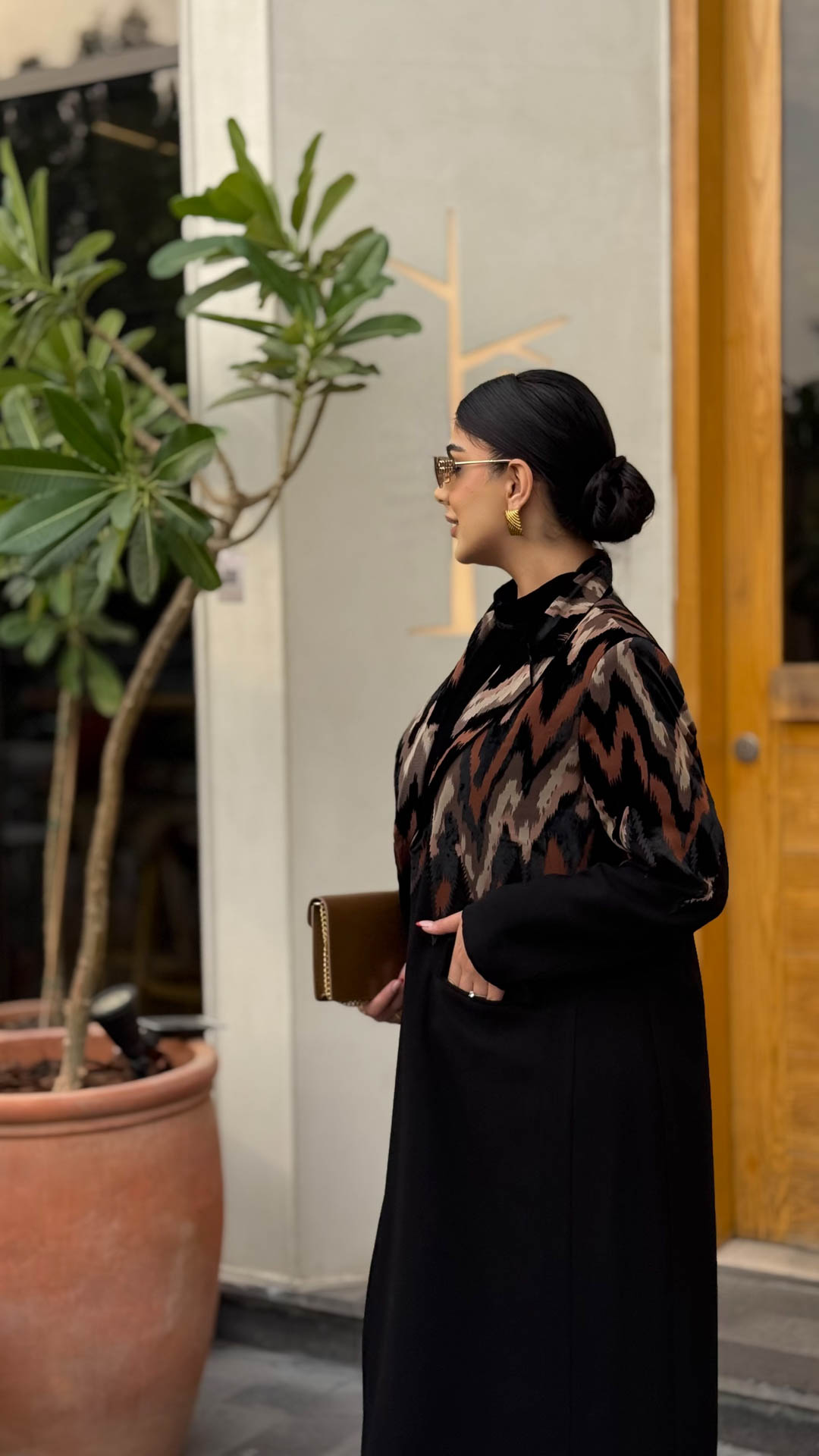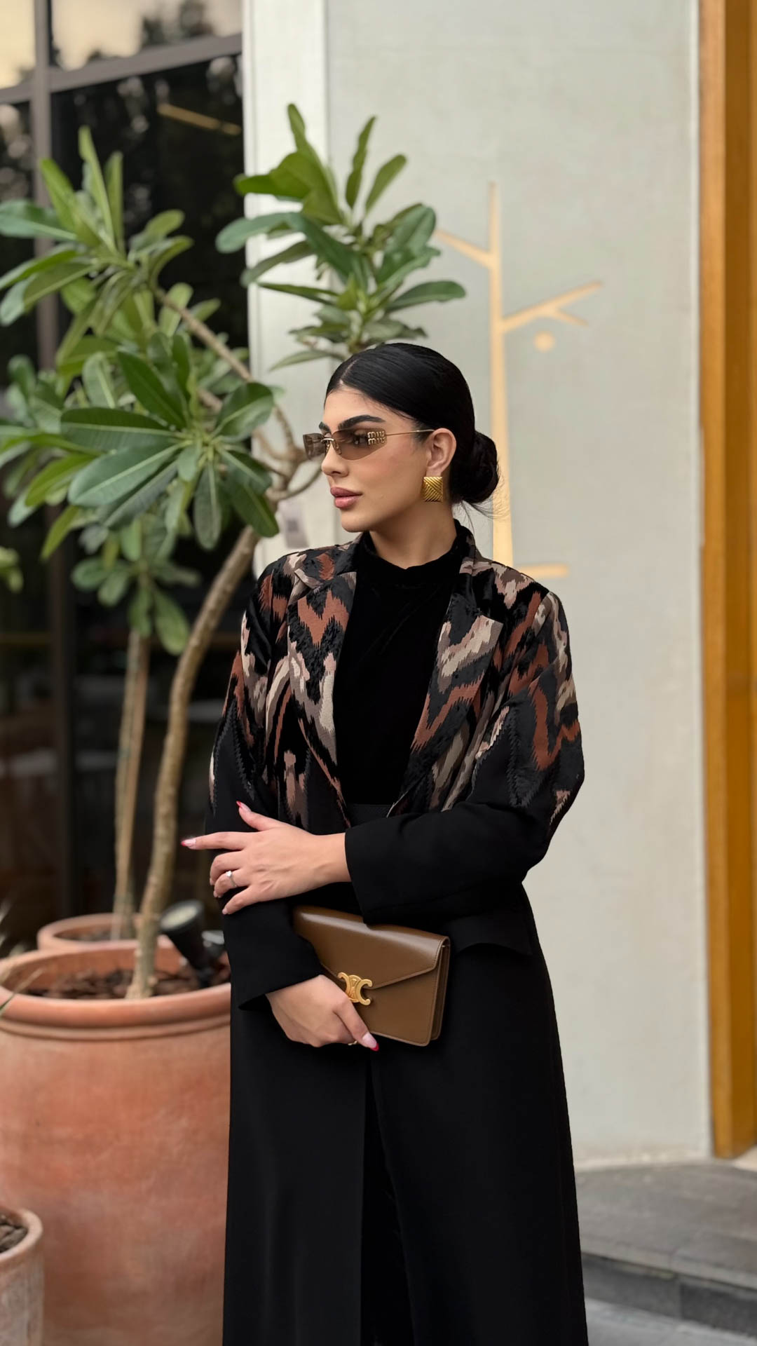 الجزء العلوي كلاسيكي أنيق، من خامة شيفون مخمل بألوان دافئة ونقشة فنية فريدة تعطيك حضور قوي وأنيق بلا مجهود