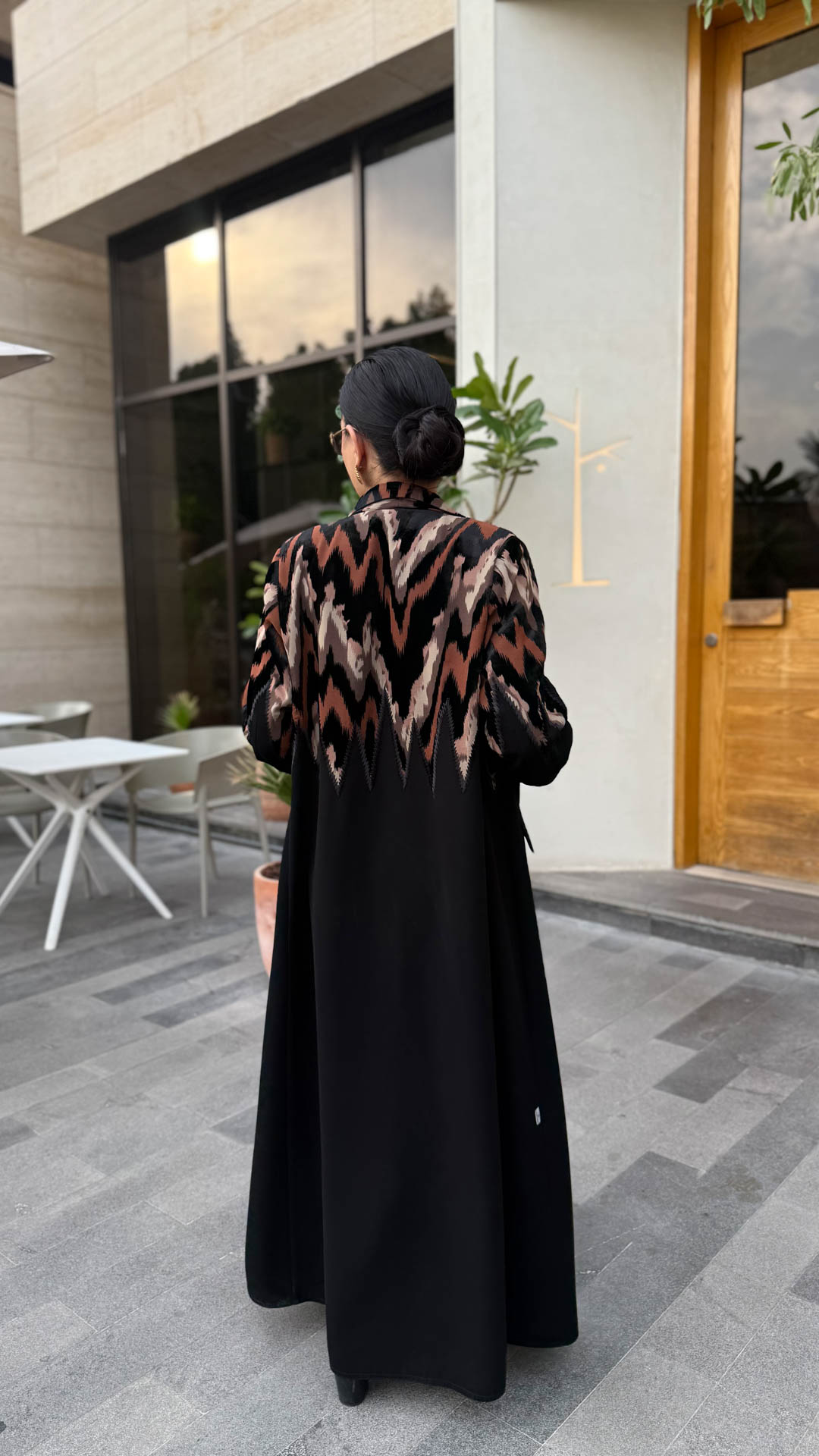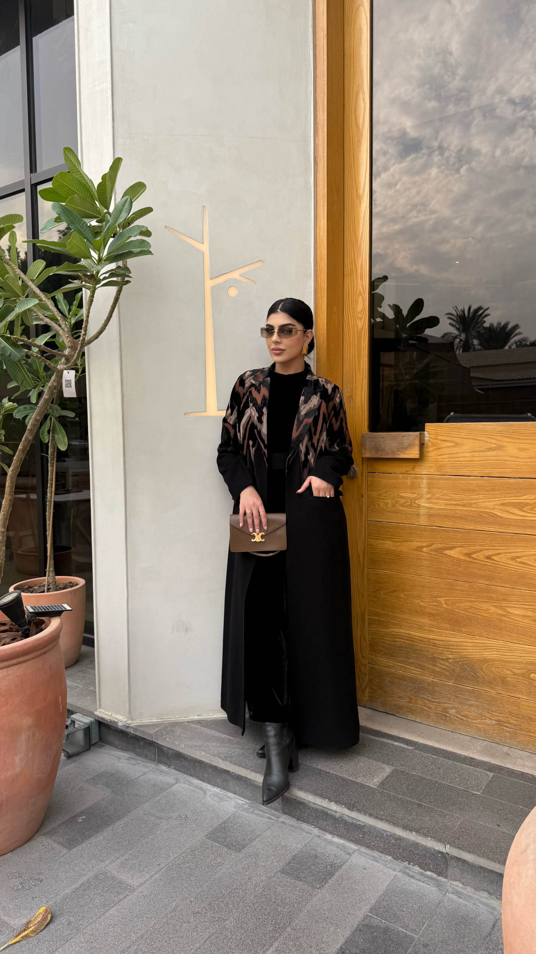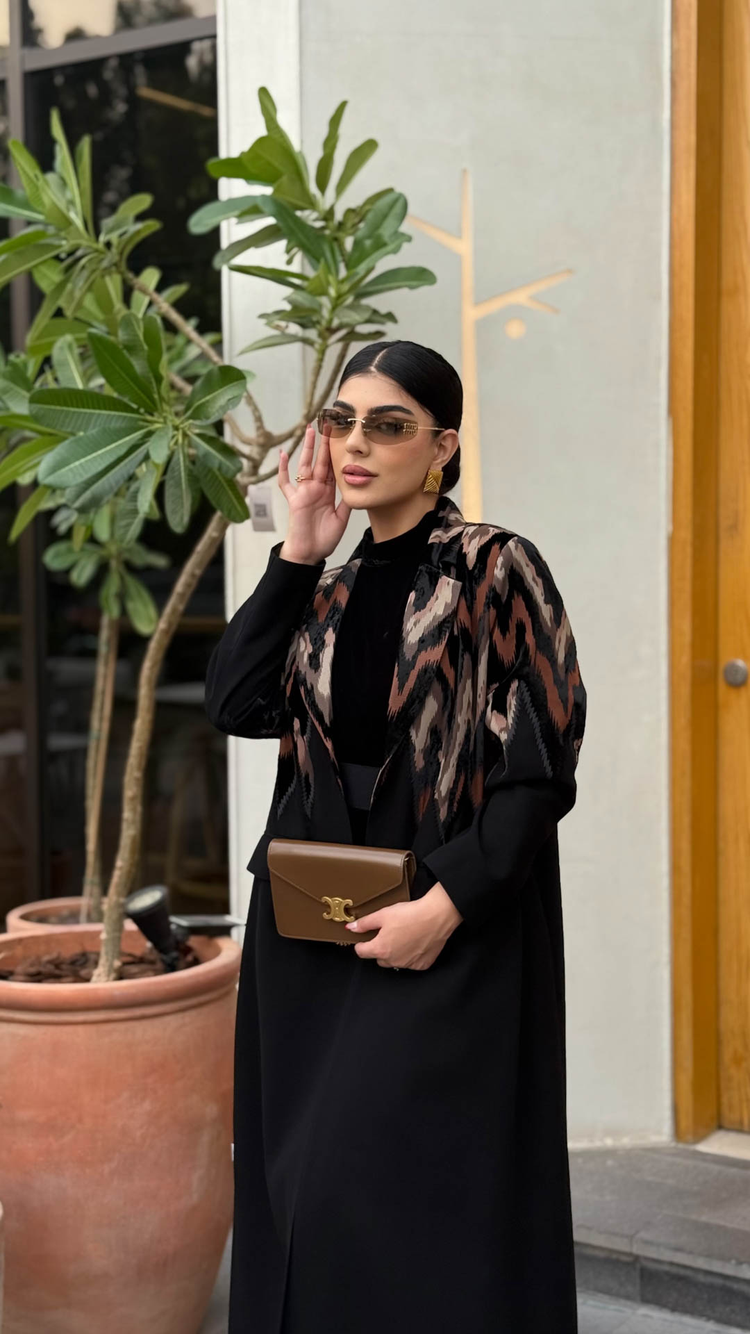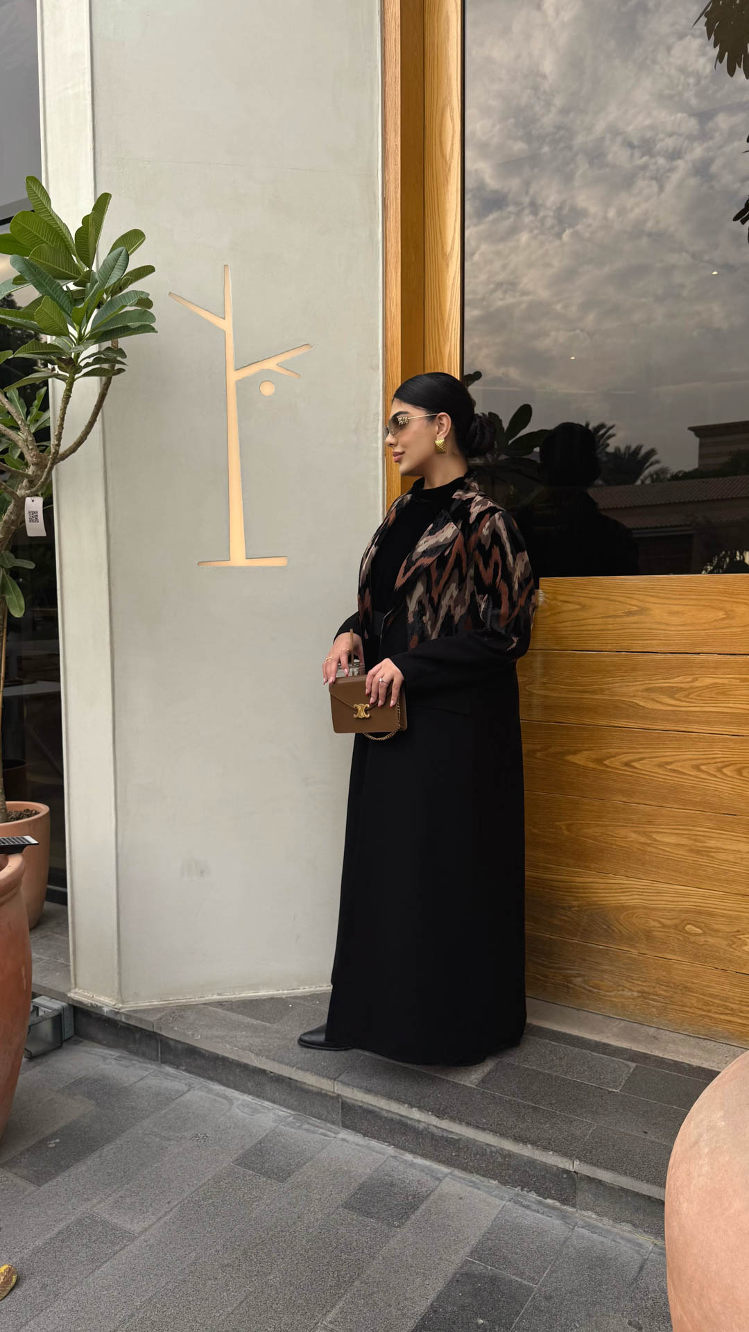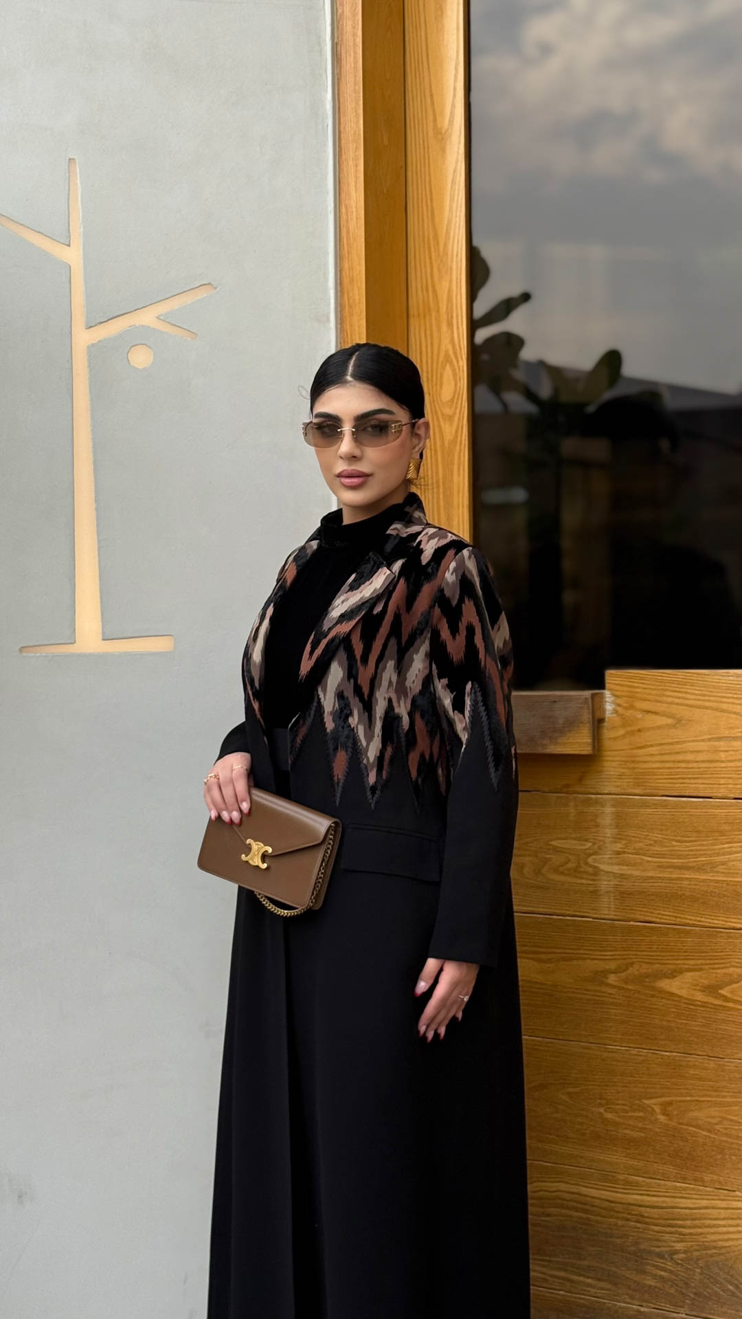الجزء العلوي كلاسيكي أنيق، من خامة شيفون مخمل بألوان دافئة ونقشة فنية فريدة تعطيك حضور قوي وأنيق بلا مجهود