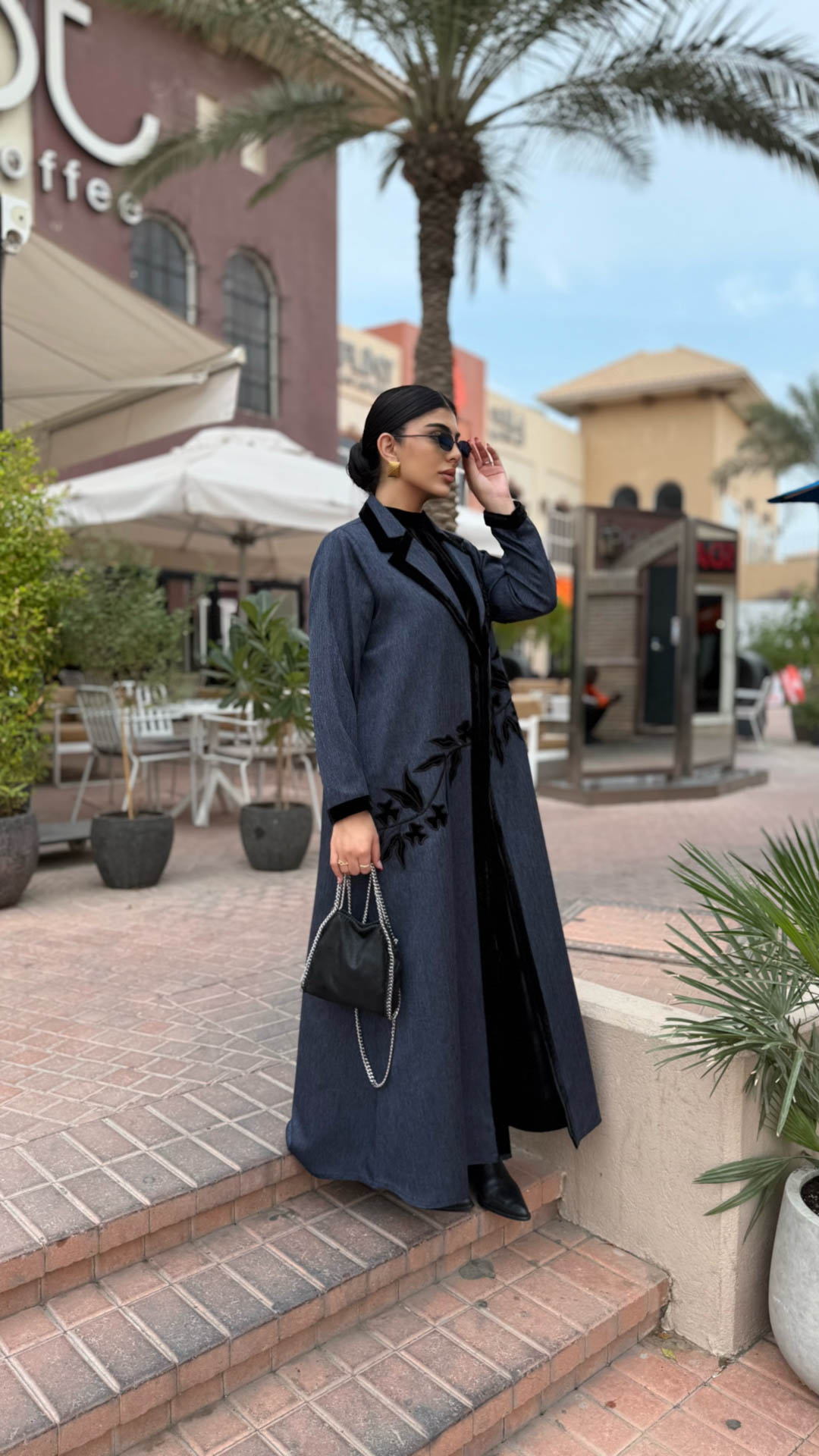 الجزء الأمامي مُزيّن بتطريز هاند ميد بالمخمل الأسود بتفاصيل نباتية فخمة تضيف عمق وأناقة للتصميم.